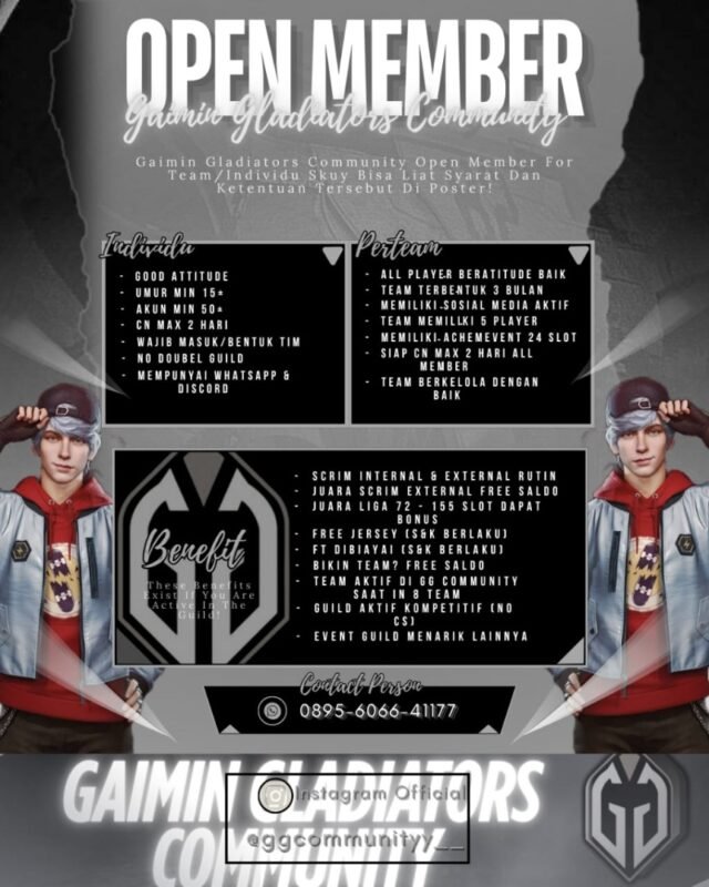 Bagi Anda pemilik suatu Brand atau Perusahaan yang ingin memperluas jangkauan brand Anda, baik secara online maupun offline dikalangan esport gaming. Kami siap bekerja sama dalam bentuk support, endorsement atau sponsorship. Jika Anda berminat untuk menjalin mitra dengan kami. Silahkan hubungi admin / management GAIMIN GLADIATORS COMMUNITY pada kontak yang tersedia di atas.